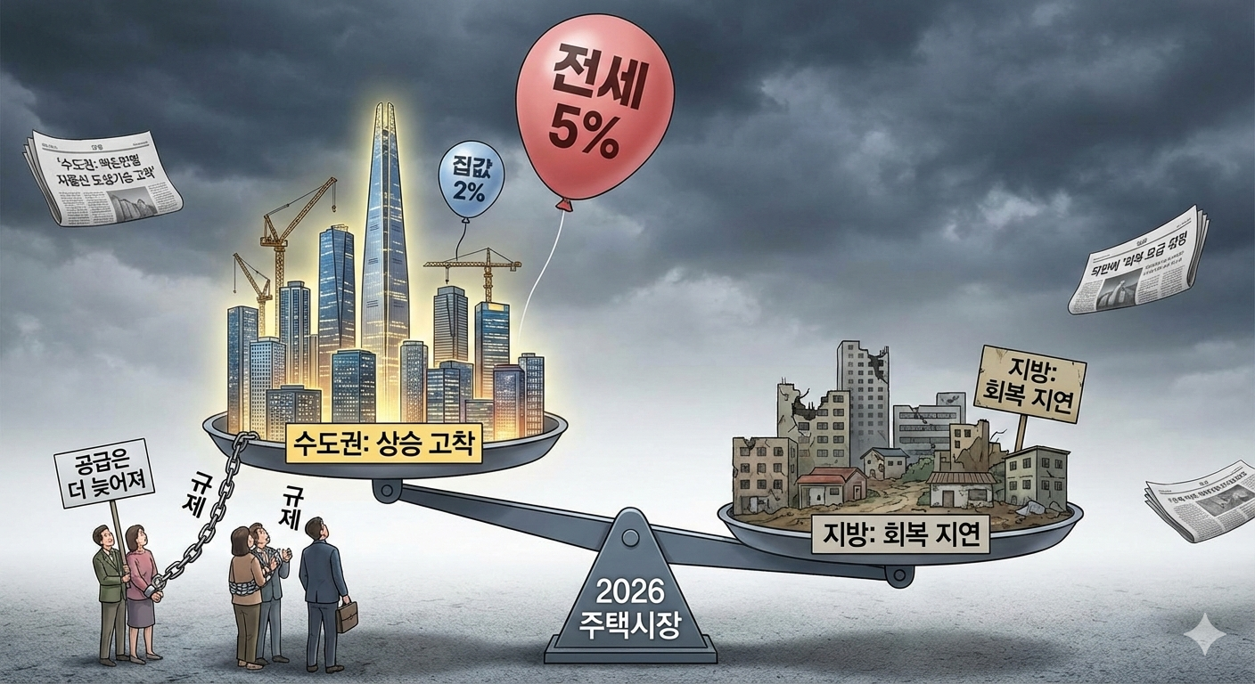 2026년 주택시장은 가격의 절대 수준보다 지역·유형 간 격차가 먼저 확대되는 국면에 들어설 것이란 전망이 우세하다. 수도권은 상승 흐름이 굳어지는 반면, 지방은 회복이 지연되며 시장의 양극화가 구조적으로 고착될 가능성이 크다는 분석이다. 규제로 수요는 묶였지만 공급은 더 늦어지면서, 시장 안정이 아닌 왜곡이 누적되고 있다는 지적도 나온다.